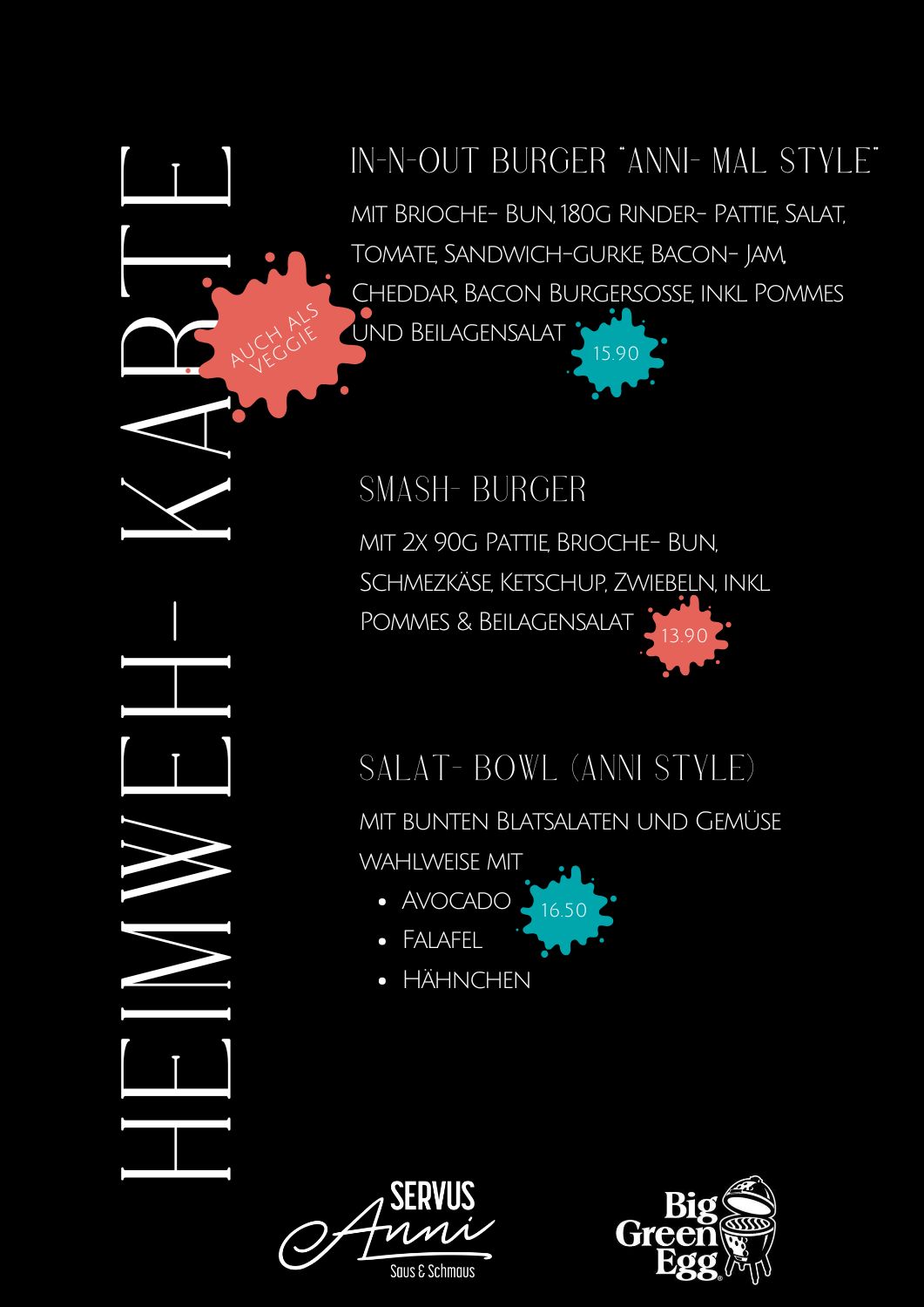 Natürlich darf unser Hausburger IN-N- Out Burger im Anni- Mal Style nicht fehlen! Beide Burger- Varianten mit Lamb Weston Fries & Beilagensalat!